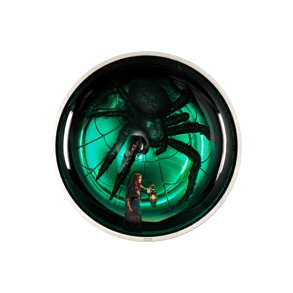 Part of the "Phobia" series, this fearsome 2 oz silver coin captures the essence of fear with its stunning design and amazing coloring that creates the illusion of a victim trapped in the lair of a monstrous spider. This silver coin has a luxurious proof quality and comes in a case along with a certificate of authenticity. Limited edition of only 999 pieces worldwide!