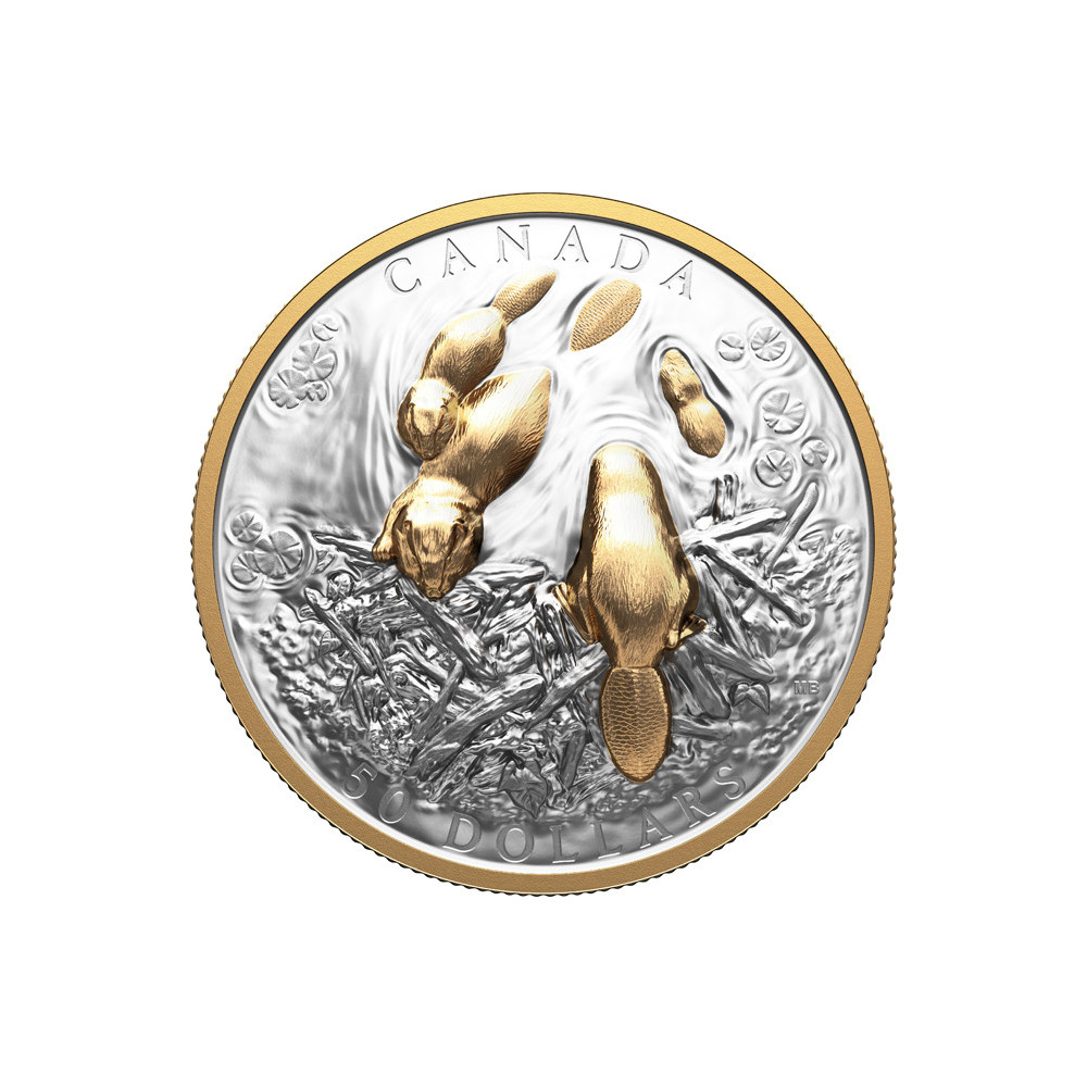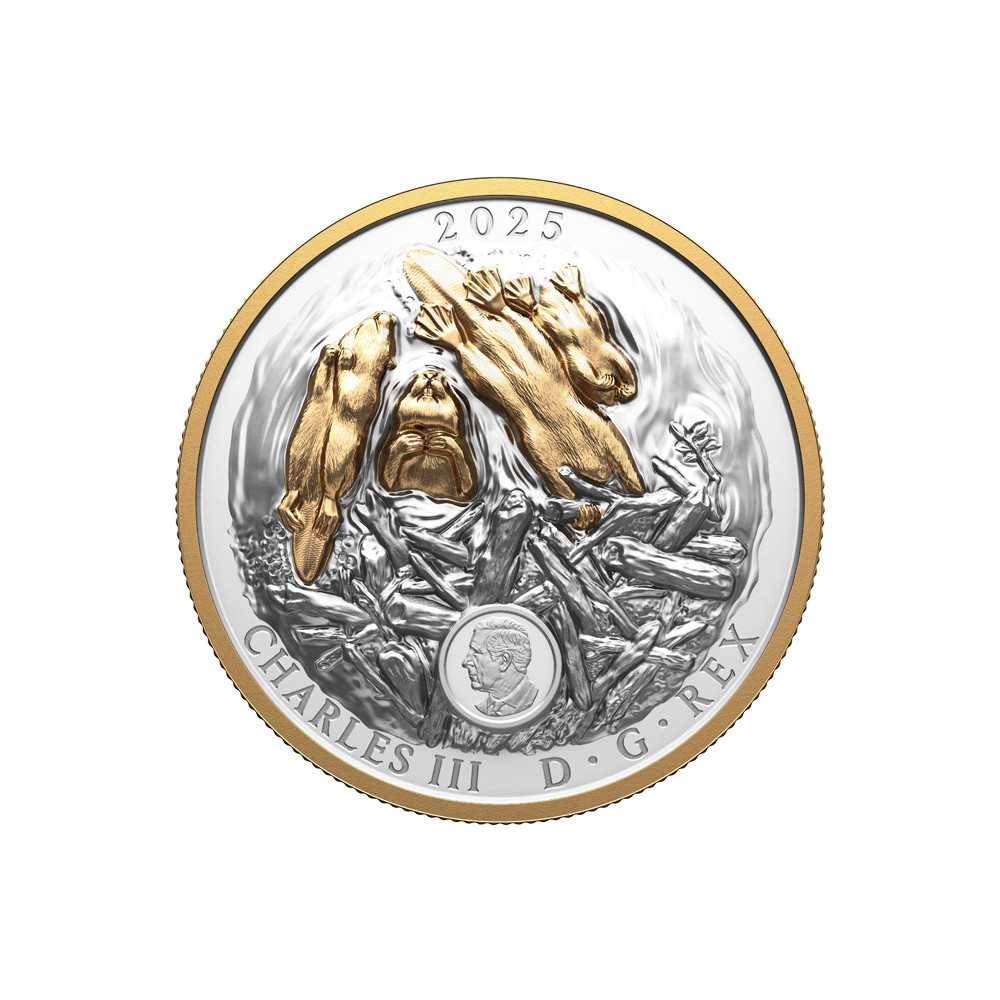 The beaver, which has been the official symbol of Canada since 1975, is a beloved natural engineer of the ecosystem, known for changing the environment to suit its needs. Although much of Castor canadensis' busy construction activities remain hidden from our view from land, its work is foregrounded on this coin, where the double-sided design welcomes you into the secret world of beavers by presenting different perspectives of the same scene.