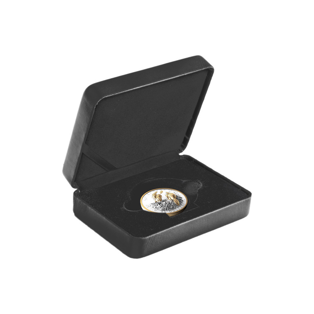 Your coin is housed in a unique floating capsule designed for vertical display, with extra-wide sides to ensure an unobstructed view from the front and back. It comes in black packaging with the Royal Canadian Mint logo and a black gift box.