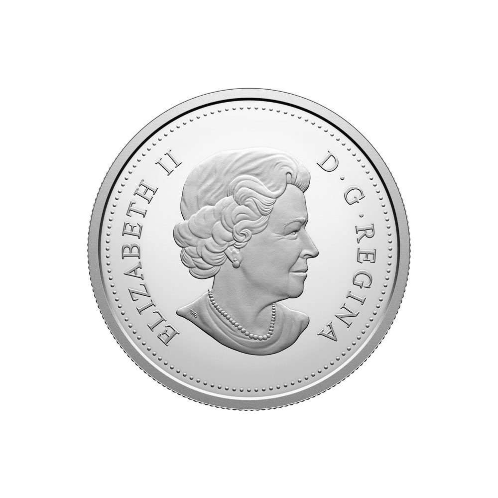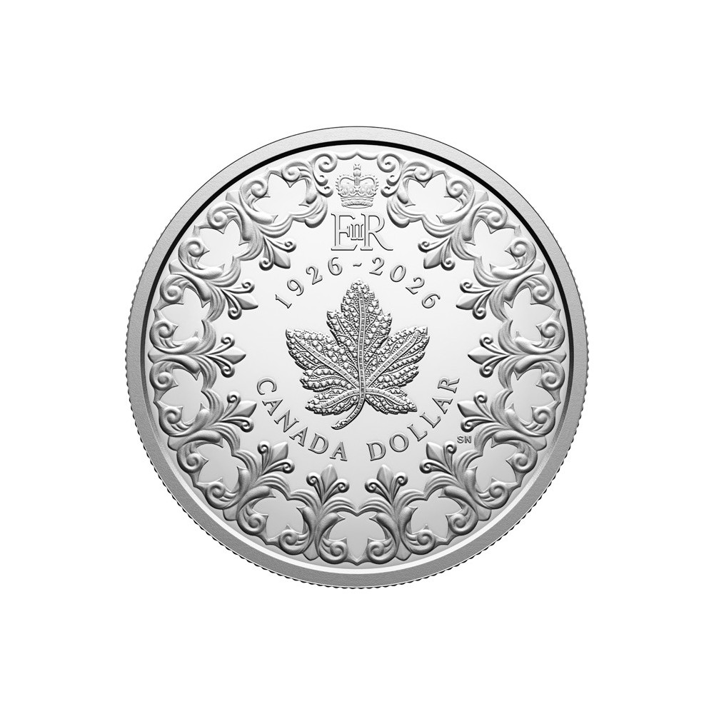 This 99.99% pure silver dollar commemorates the 100th anniversary of Queen Elizabeth II's birth and features a uniquely Canadian tribute: a depiction of the maple leaf-shaped diamond brooch worn by Queen Elizabeth II as a symbol of her personal relationship with Canada, complete with the royal monogram (above) that served as her personal emblem. The noble leaf is crowned with filigree embellishments symbolizing grace and heritage, and includes 13 maple leaves (one for each province and territory) set in the negative space of the filigree - a subtle but profound tribute that permeates the artwork, much like Queen Elizabeth II's unwavering presence in Canadian history.