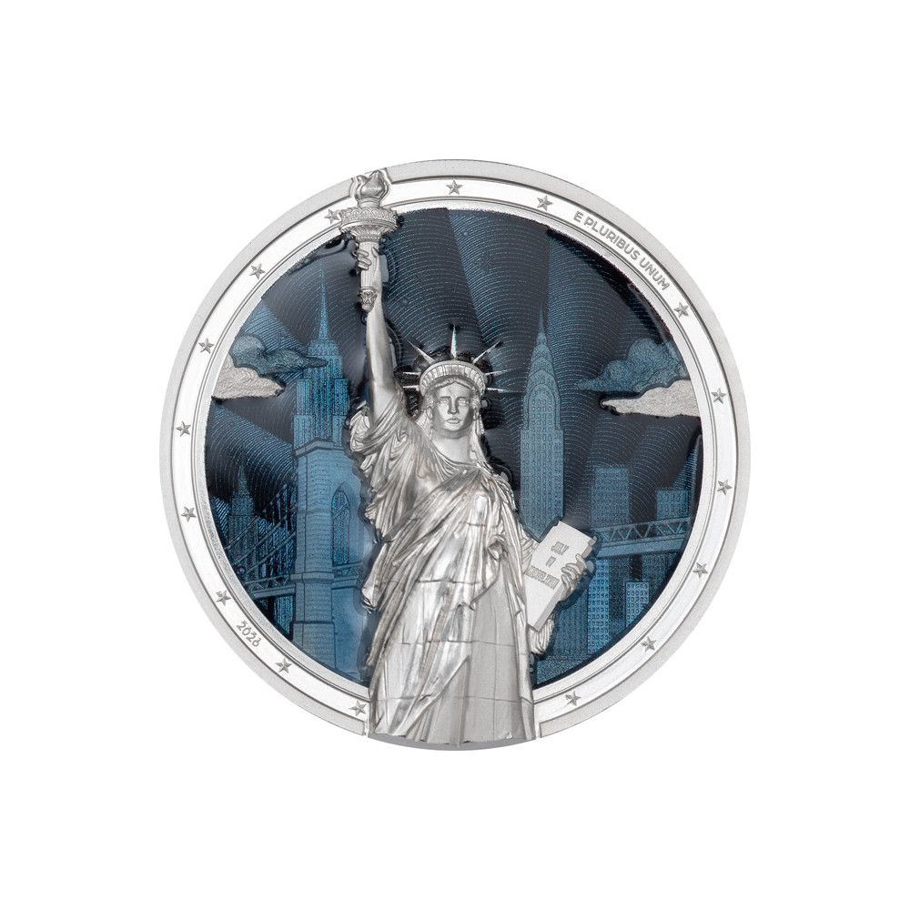 The background consists of the Manhattan skyline against a backdrop of fine guilloche lines, symbolizing the charm of this famous borough. The aesthetic impression is completed by the enamel, which separates the Statue of Liberty from the rest of the coin in a special way, deliberately making it a real magnet for the eyes. A very successful modern interpretation of a timeless icon.