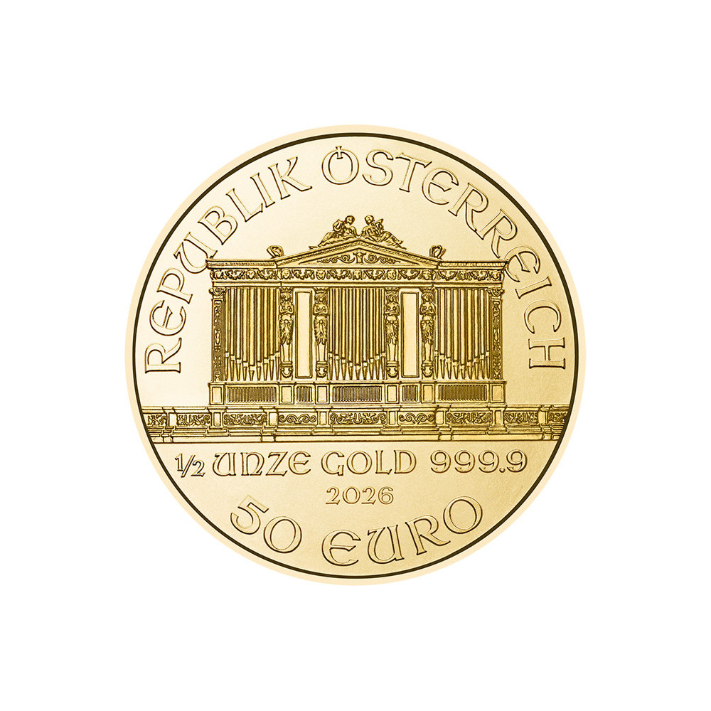 Wienfilharmonikerna har fått sitt namn från den berömda österrikiska orkestern, som är en av de bästa i världen. På guldmyntets framsida avbildas den stora orgeln i Wiens Musikverein. Under orgeln stämplas vikten 1/2 uns, finhalten 999,9, präglingsåret och det nominella värdet 50 EURO. Inskriptionen "REPUPLIK ÖSTERREICH" är stämplad ovanför. På baksidan avbildas några musikinstrument från filharmonikerna och på den övre kanten syns orkesterns namn och guldmyntets "WIENER PHILHAMRONIKER". Liksom ovanstående guldmynt finns Wienfilharmonikerna i storlekarna 1 oz, 1/4 oz, 1/10 oz och 1/25 oz.