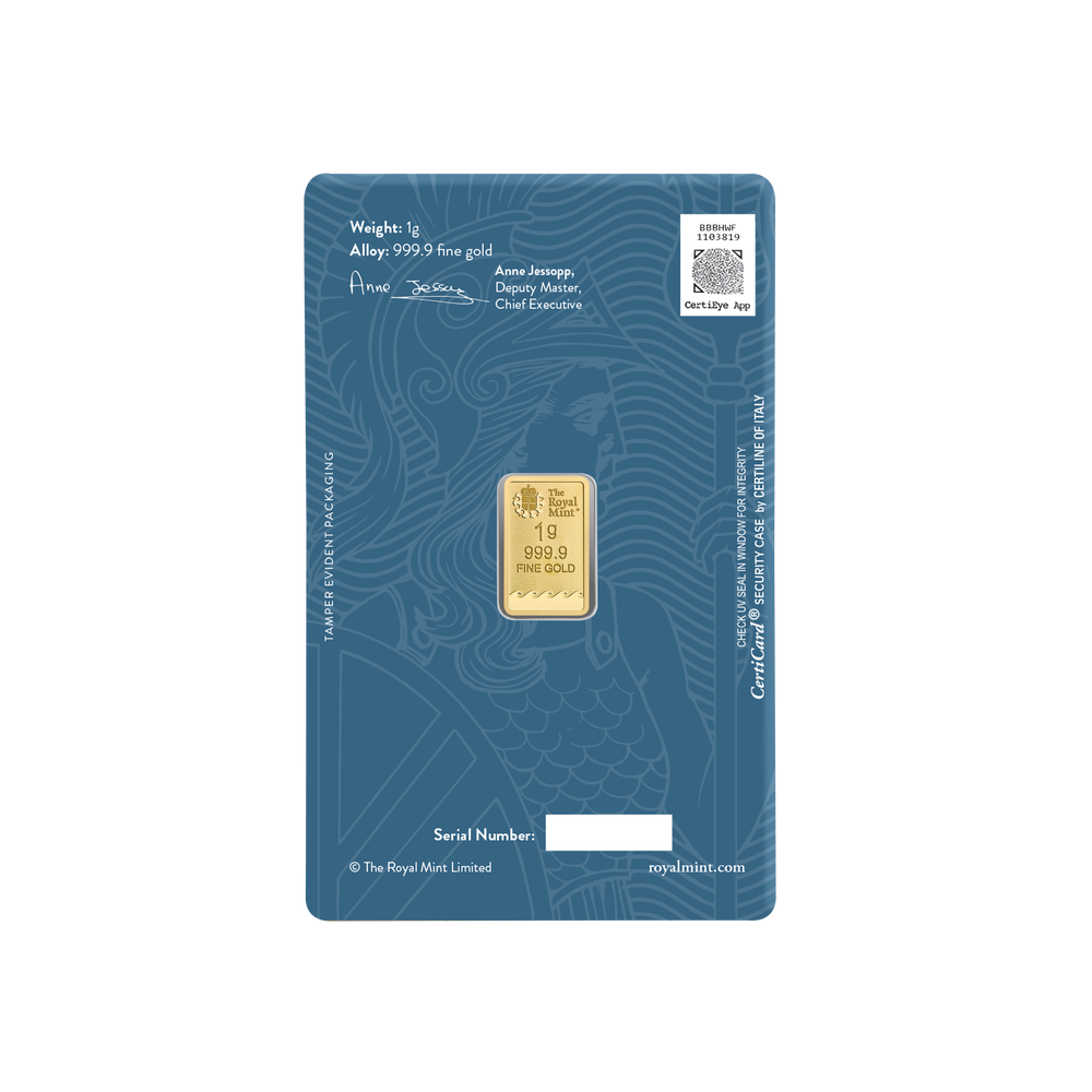 Denna guldtacka innehåller 1g av 999.9 fint guld och är en omisskännlig förkroppsligande av brittisk stolthet och mod.
