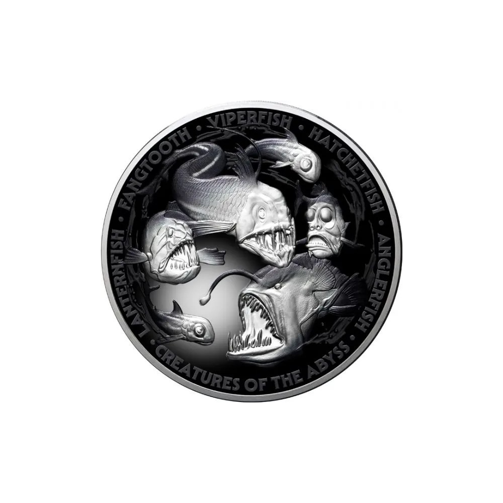 Med imponerande 5 uns av rent 99,9% SILVER, är den 65mm diameter stora baksidan ett fönster in i undervattensavgrunden. Bioluminescerande belysning, eller staven av en fiskares fisk, belyser de skrämmande invånarna i djupet. Dessa arter lever i havens grumliga bathypelagiska zon på 300 till 1 500 meters djup. På detta djup finns det inget ljus och vattnet är nästan iskallt!