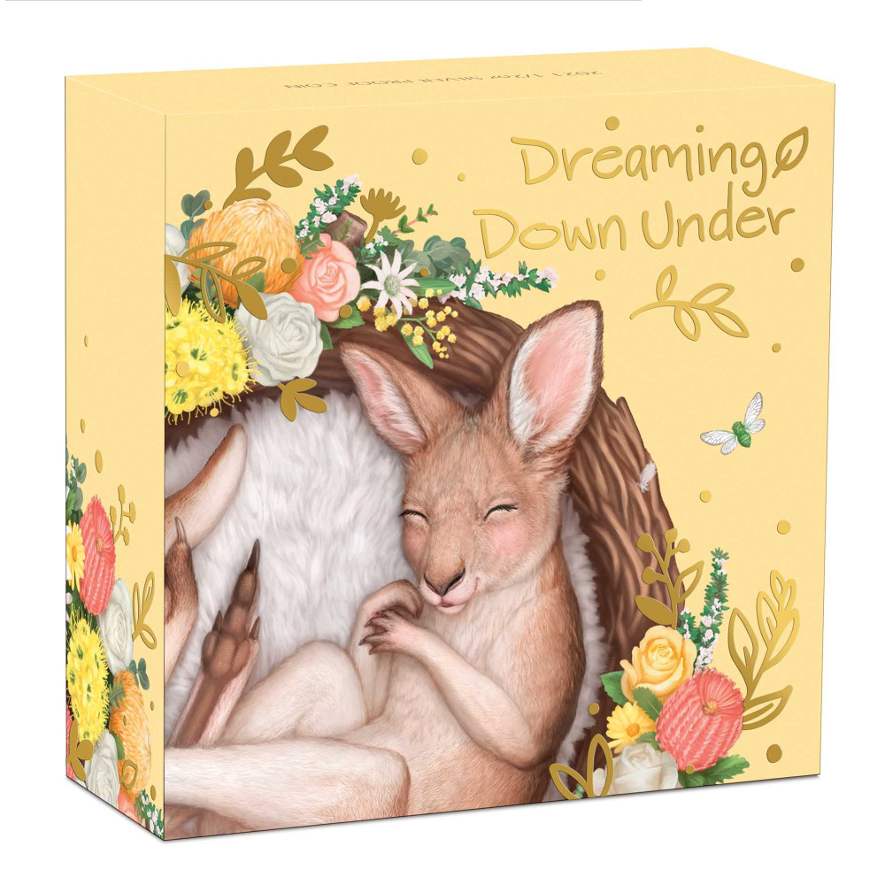Myntet avbildar en söt kängurubebis som sover i en kvistkorg fodrad med fleece - en rekvisita som har blivit en populär trend i nyföddfotografering bland föräldrar runt om i världen. Förutom Perth Mints "P" myntmärke, så visar designen också färgstarka australiensiska blommor och djurliv.