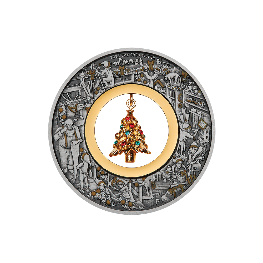 "Tomtens verkstad" myntet är ett unikt samlarmynt som väger 2 uns av rent silver (Ag999.9) med antik finish. Det avbildar en magisk scen från tomtens verkstad, full av nissar, presenter och julglädje. Ett idealiskt mynt för samlare som uppskattar den konstnärliga behandlingen av jultemat och fint hantverk.