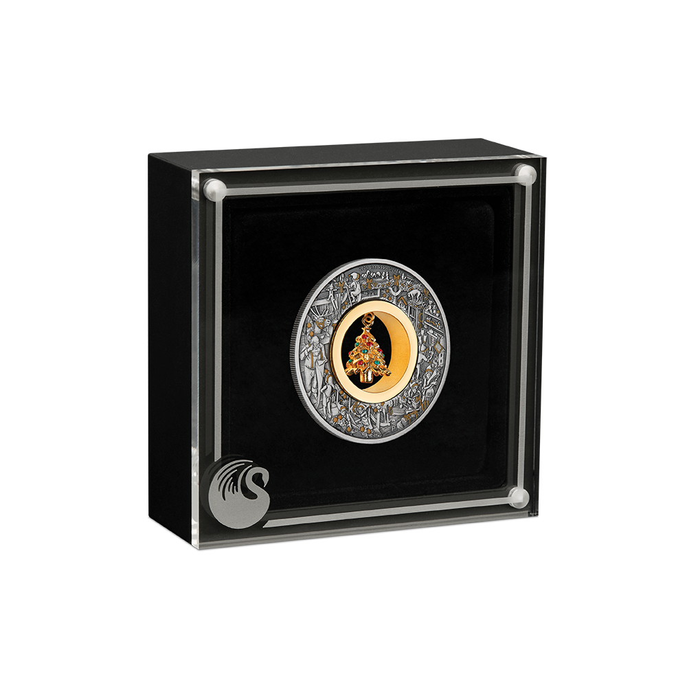 Myntet är inrymt i ett klassiskt displaycase med ett transparent lock. Det är förpackat i en guldfärgad julklappsask med rosett och levereras med ett numrerat äkthetscertifikat.