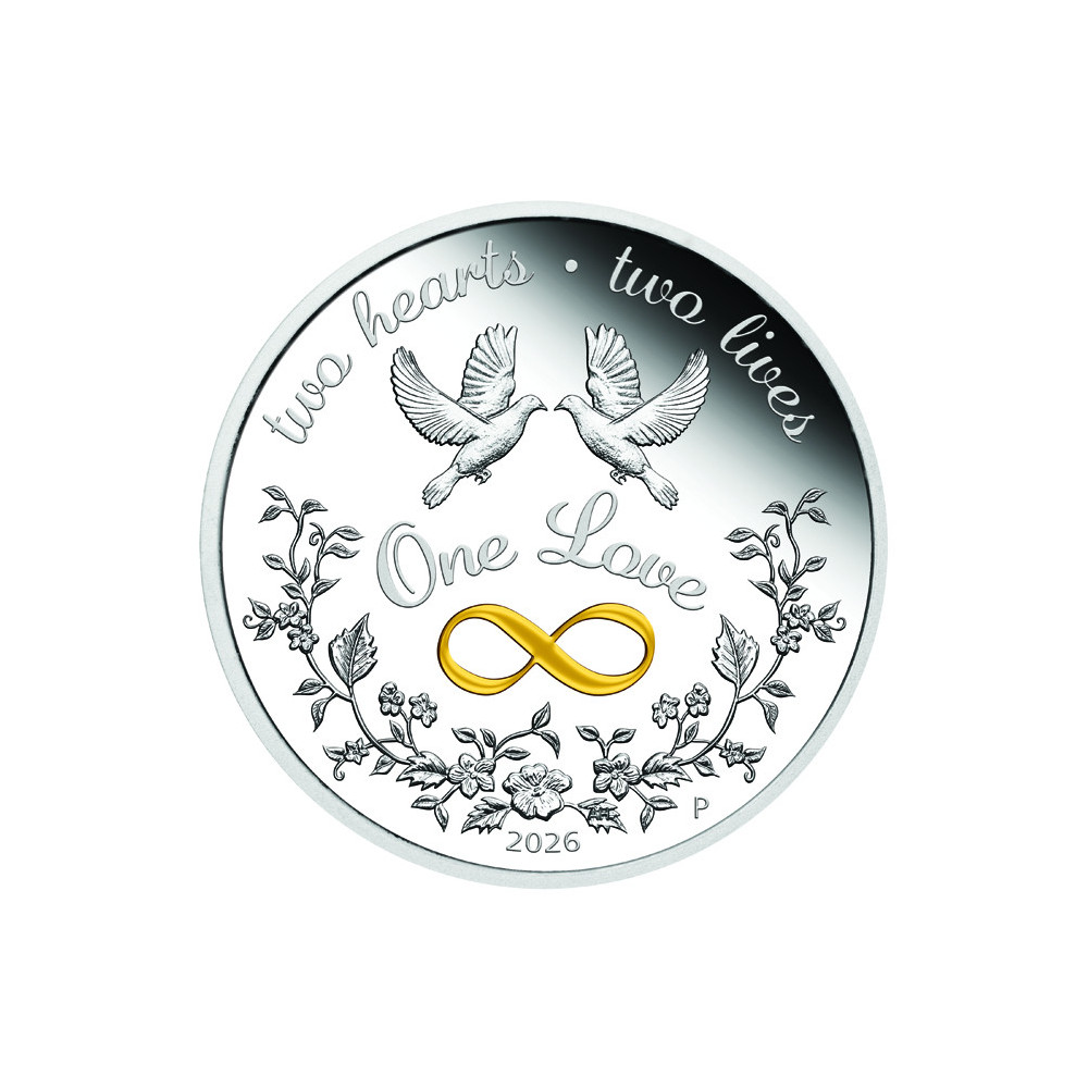 På myntets baksida finns två duvor och en färgstark oändlighetssymbol samt inskriptionerna "ONE LOVE", "TWO HEARTS", "TWO LIVES" och präglingsåret - 2026.