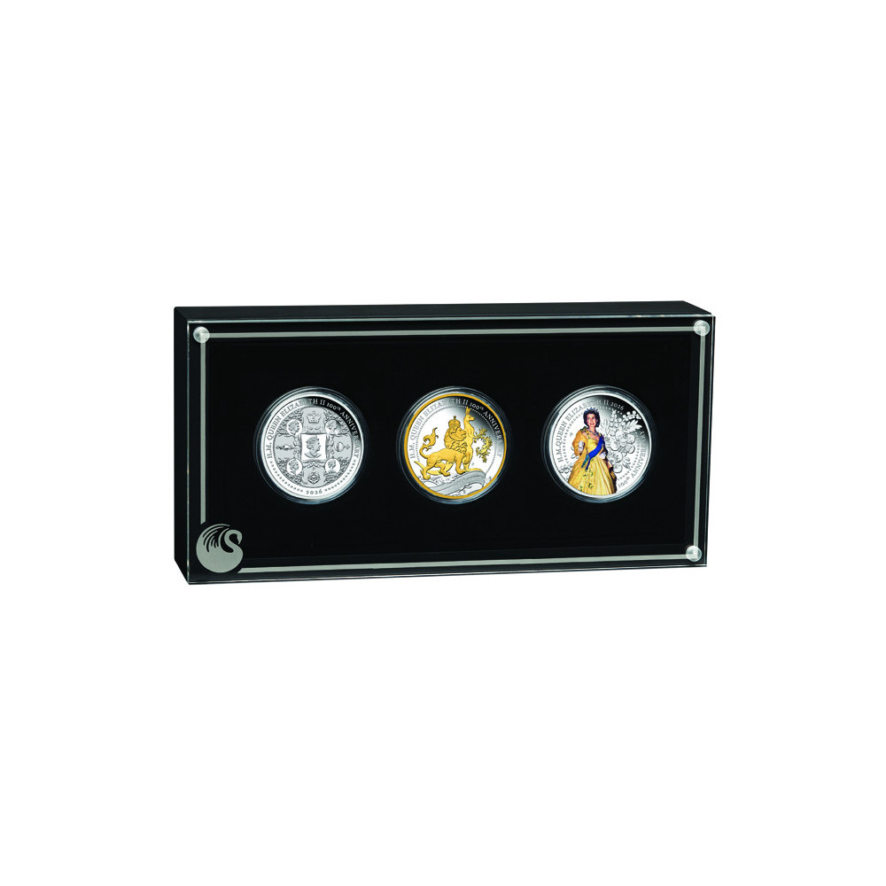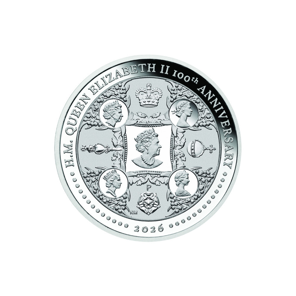 - Ett silvermynt (7.000 total myntning) med fem avbildningar av Drottning Elizabeth II som representerar olika perioder av hennes regeringstid, omgiven av guldkorg och kungliga regalier.
