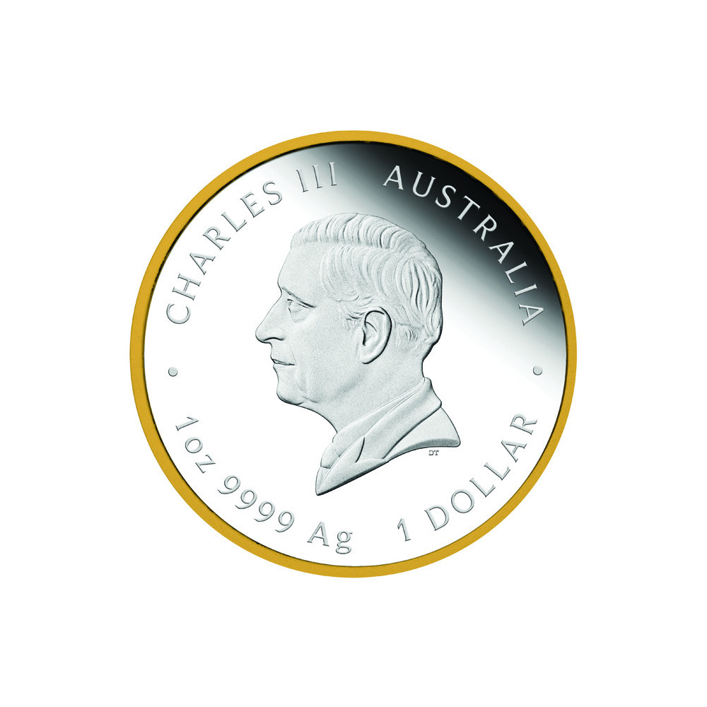 - Ett guldpläterat mynt (total myntning 3 926) med en stiliserad minnesflorin från 1954 med ett lejon och en känguru, båda djur, och en kant vackert markerad i 24 karats guld.