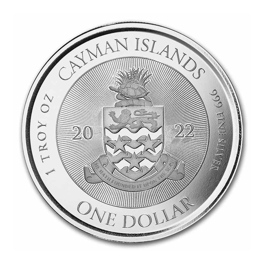 Visar Caymanöarnas vapensköld tillsammans med metallvikt, renhet och nominellt värde.