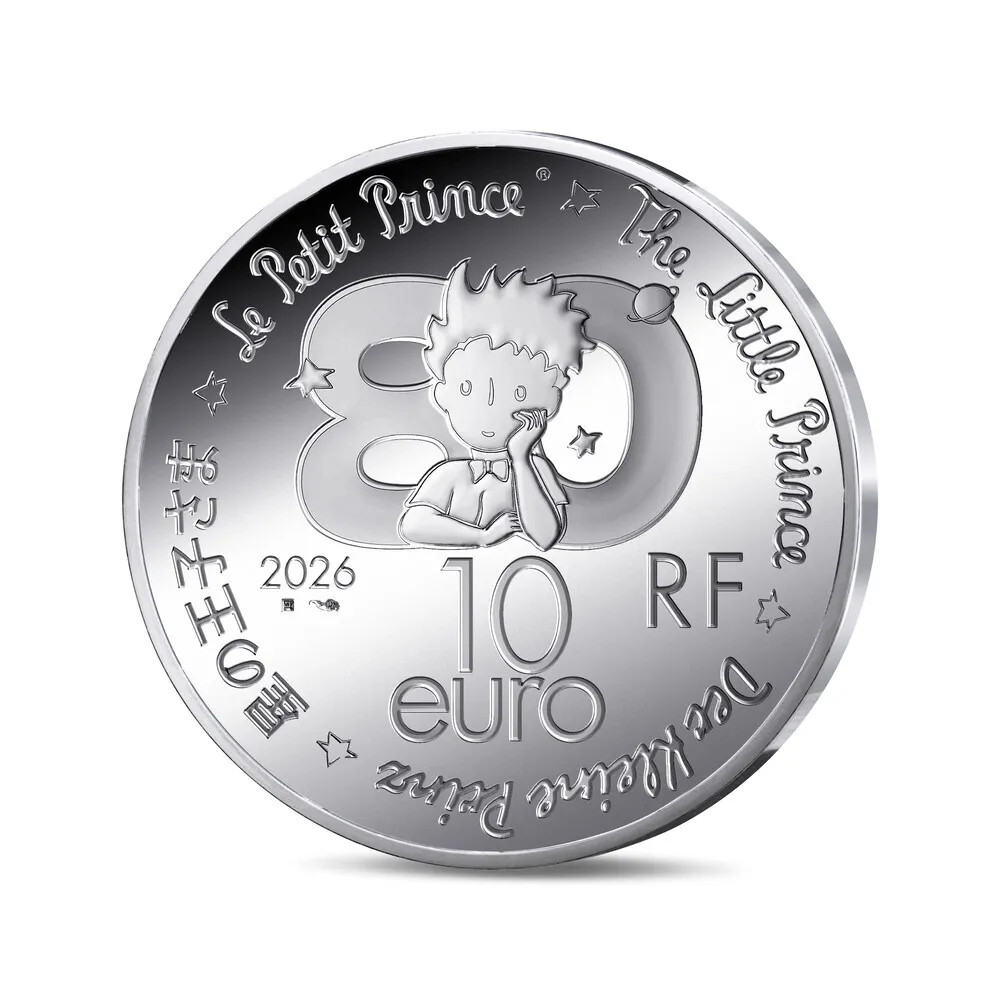 På myntets baksida, ovanför valören, finns logotypen för 80-årsjubileet för den lille prinsen, som består av en byst av figuren som lutar sig på sin arm framför siffran 80. Längs kanten påminner inskriptionen "Den lille prinsen" på franska, engelska, tyska och japanska om den universella dimensionen hos denna figur. Dessutom finns RF-märket, märkena för gravyrverkstaden och gravyrmästaren samt årtalet 2026.