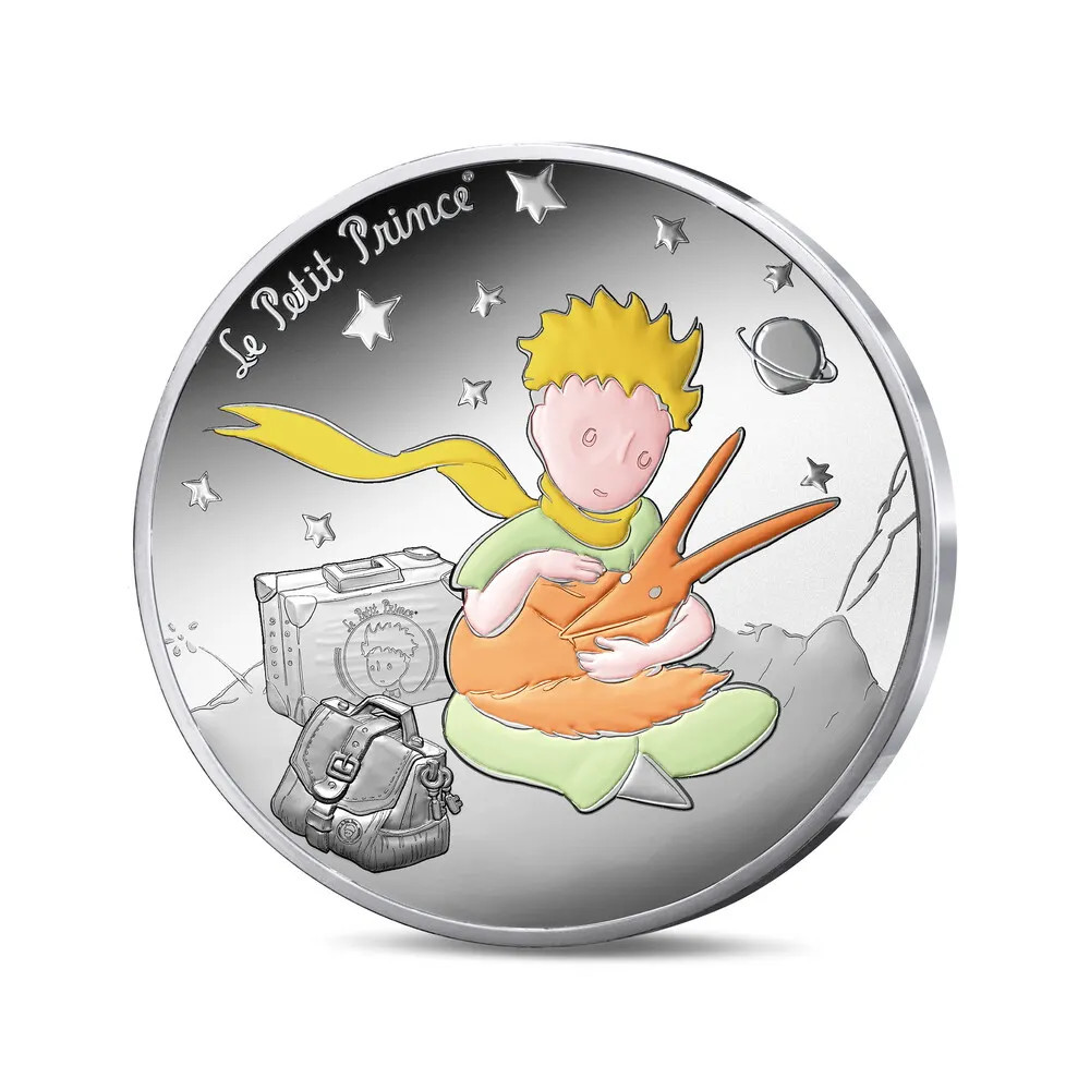På myntets framsida sitter den lille prinsen med benen i kors i mitten på ytan av sin planet. Han tittar kärleksfullt på räven som han håller i sina armar. Till vänster om figuren står två resväskor, redo för sin ägare att ge sig ut på sin resa. Bakom den lille prinsen är himlen ljus av stjärnor, bland vilka Saturnus kan ses. Längs kanten av myntet är den lille prinsens logotyp ingraverad i himlen.