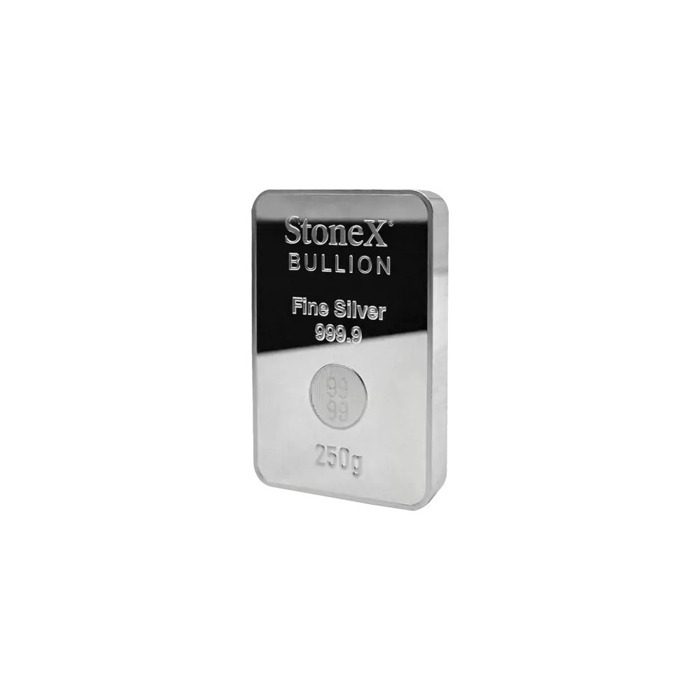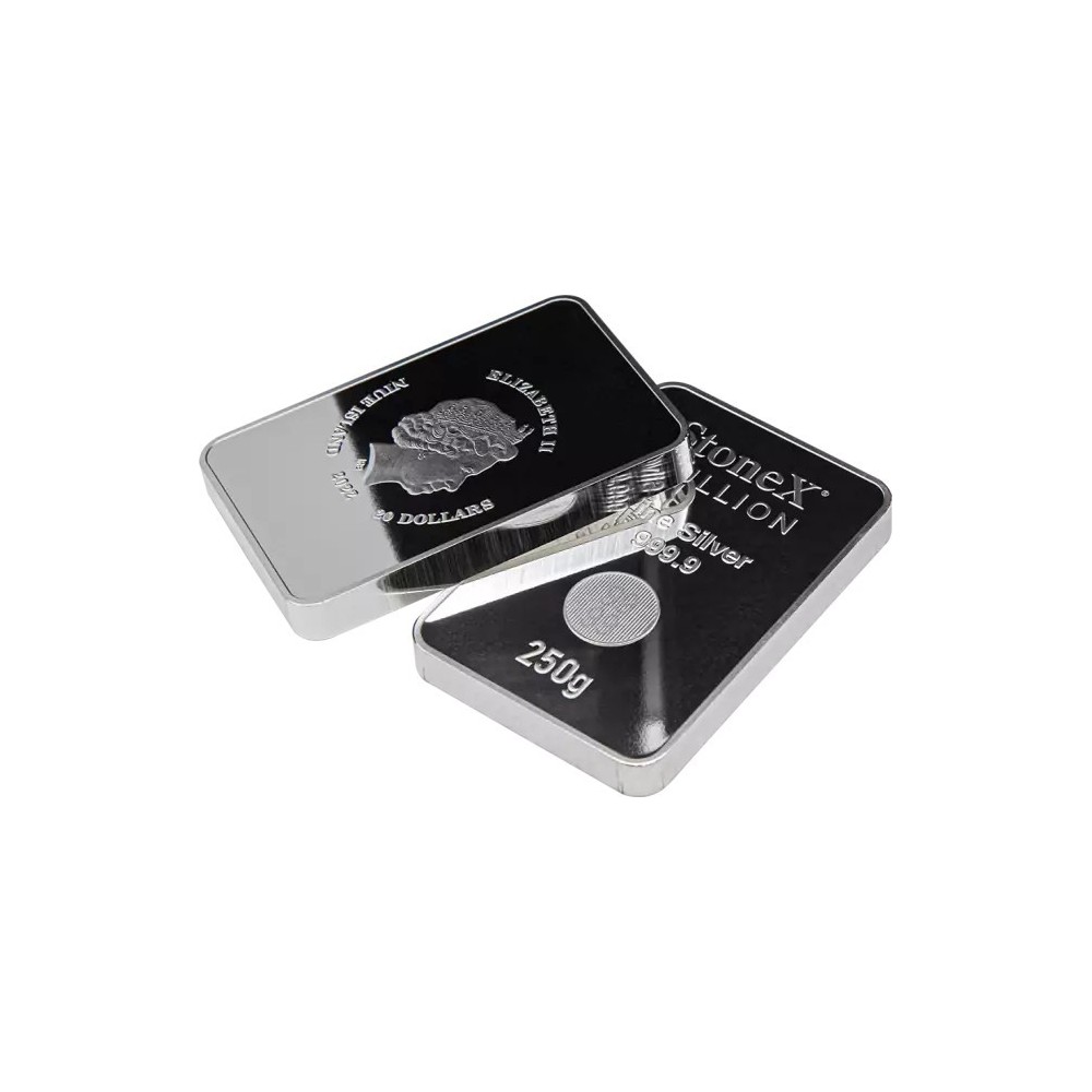 StoneX 250 gr silvermynt med en renhet på 999,9% och en blank yta är en utmärkt investeringsmöjlighet. Ingot är 70 mm långt, 47 mm brett och 6,9 mm tjockt. Baksidan visar några av följande specifikationer: renhet, Fine Silver och 4 nior, och en vikt på 250 gr. På myntets baksida finns ett porträtt av drottning Elizabeth II, utfört av skulptören Ian Rank-Broadley (initialerna finns under Her Majesty). Detta porträtt gjordes 1998 och visar en mer mogen men vacker drottning som bär pärlörhängen med Queen Mary-knappar och en tiara för flickor från Storbritannien och Irland. Under bilden av drottning Elizabeth finns årtalet 2022, valutan och värdet 20 USD och NIUE, eftersom det är lagligt betalningsmedel på Niue.